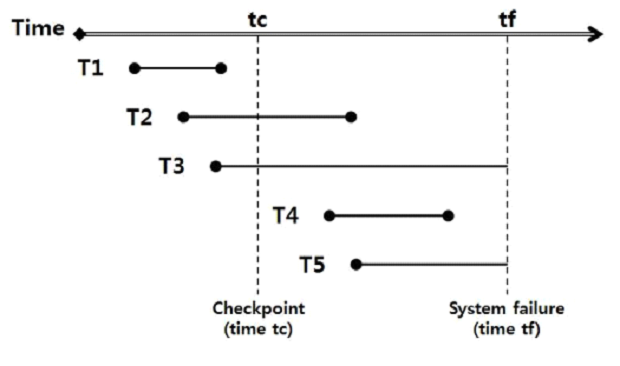 - T1~T5 5개의 트랜잭션이 병행 처리되는 과정에서 시스템 장애가 발생한 상황.