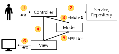 - Controller: HTTP 요청을 받아 파라미터 검증 및 비즈니스 로직 실행. View에 전달할 결과 데이터를 Model에 담기