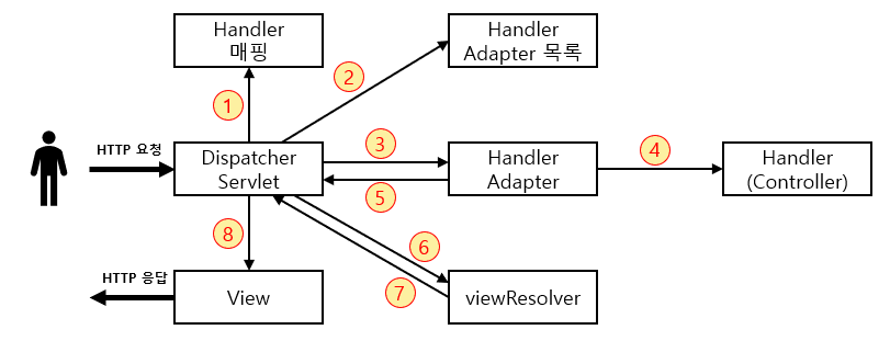 네모 박스 안의 매핑과 어댑터들은 Spring boot가 자동으로 등록하는 것들로, 지금 설명에 필요한 부분만 명시했다.