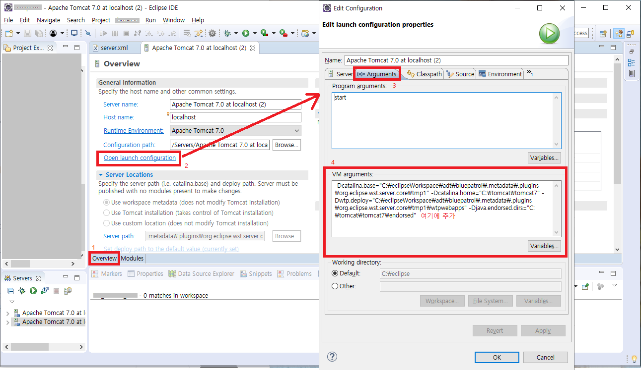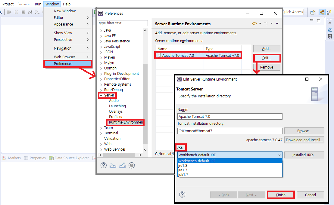 -> Windows - preferences - Server - Runtime Environments - 사용하는 톰캣 버전 선택 - Edit - 프로젝트에서 사용하는 JRE 버전 선택 후 저장