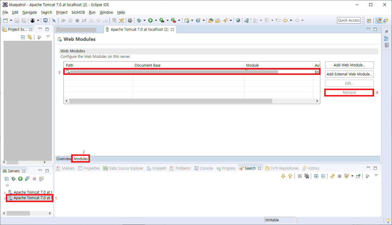 -> Servers에서 사용하는 server 더블 클릭 - Modules 탭 - 해당 경로 삭제 후 저장 - 재시작