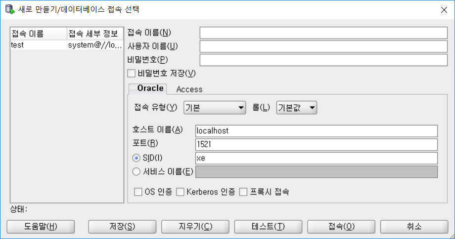 위 항목들에 각자 값을 입력하자 리스너가 거부되었다는 식으로 " Listener refused the connection with the follwing error:ORA-12505, TNS:listener does not currently ... " 라는 오류가 뜬다.