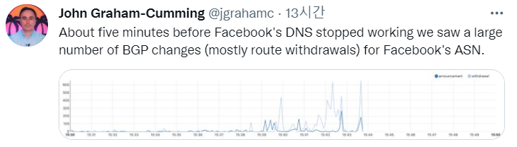 페이스북에서 공식적인 입장이 있지는 않았지만, Cloudflare 측에서 대규모 BGP 변경이 있었다는 트윗이 올라왔다.