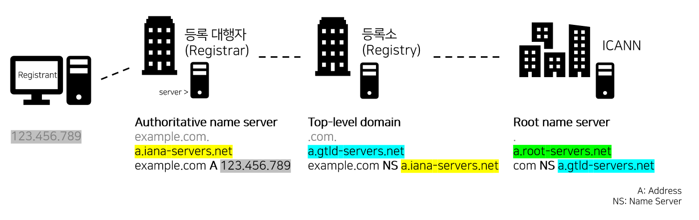 (example.com 이라는 도메인의 Name Server는 a.iana-servers.net 이라는 의미) - 등록 대행자는 등록소에게 example.com NS a.iana-servers.net이라는 정보를 전달