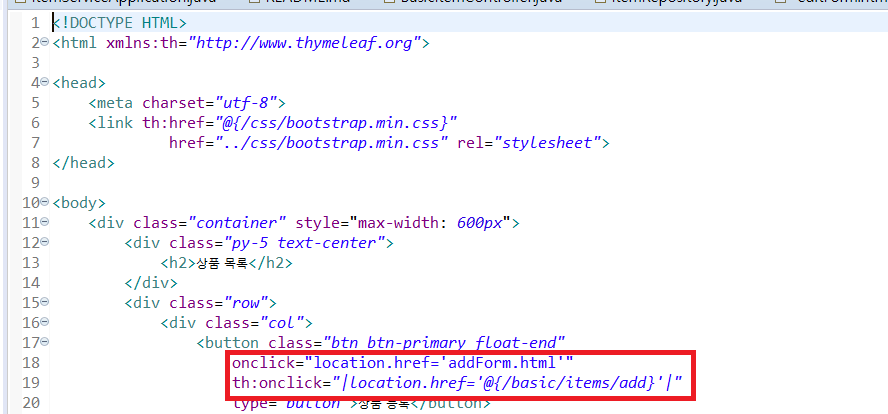 | @{ ... } | URL 링크 표현식 | th:href="@{/css/bootstrap.min.css}" th:href="@{/{itemId}/edit(itemId=${item.id})}" |