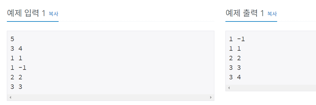 2차원 평면 위의 점 N개가 주어진다. 좌표를 x좌표가 증가하는 순으로, x좌표가 같으면 y좌표가 증가하는 순서로 정렬한 다음 출력하는 프로그램을 작성하시오.