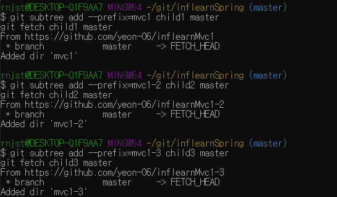 $ git subtree add --prefix=<저장할 폴더명> <자식 레포지토리의 remote명> <부모 레포지토리의 브랜치>