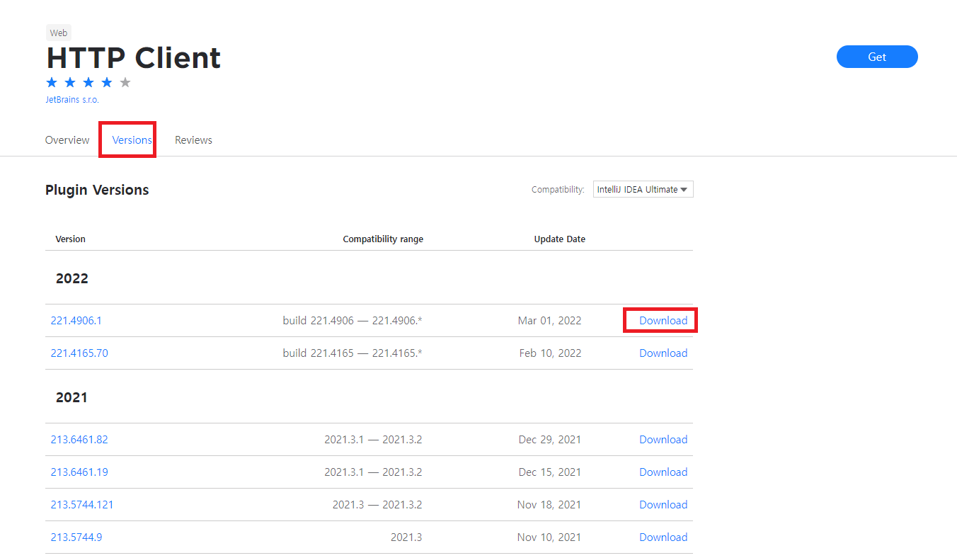 원하는 플러그인에 들어가서 Versions 탭에 들어가면 zip 파일을 다운받을 수 있다.