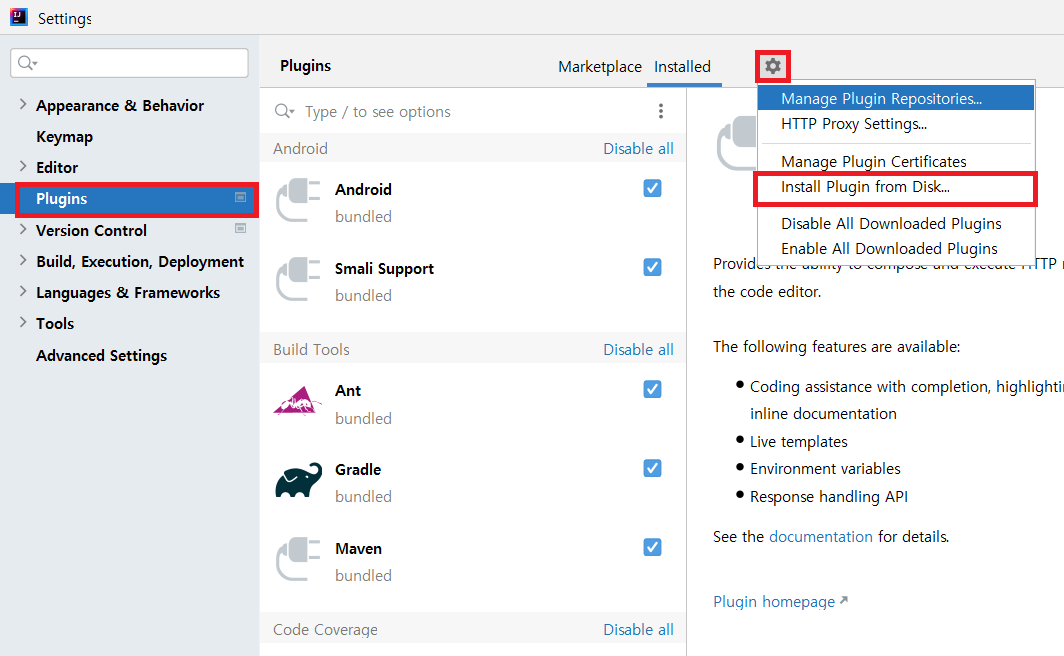 - Settings - Plugins - 톱니바퀴 - Install Plugin from Disk ... - 파일 선택