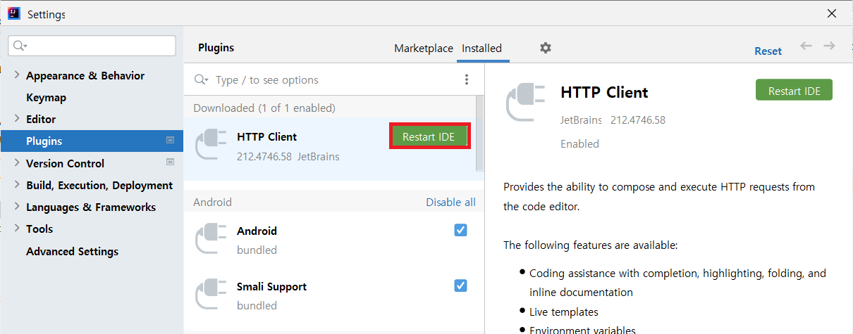 Settings - Plugins - Marketplace에서 검색을 해보아도 플러그인 검색 자체가 안된다.