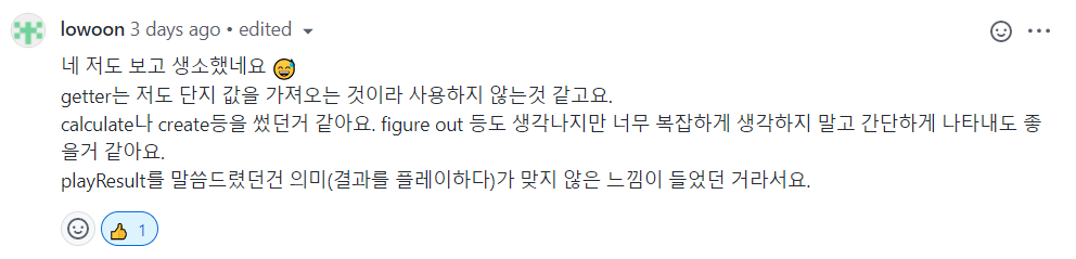 로운: 제가 다는 코멘트는 한가지의 의견일 뿐입니다! 정답이 아니기 때문에 보고 맞다고 생각하는 부분은 반영하고 아닌 것 같다라고 느껴지는 부분은 지금처럼 자신의 생각을 얘기하고 의견을 물어보는 방식이 연로그만의 기준을 잡는 것에 도움이 될거라고 생각해요ㅎㅎ