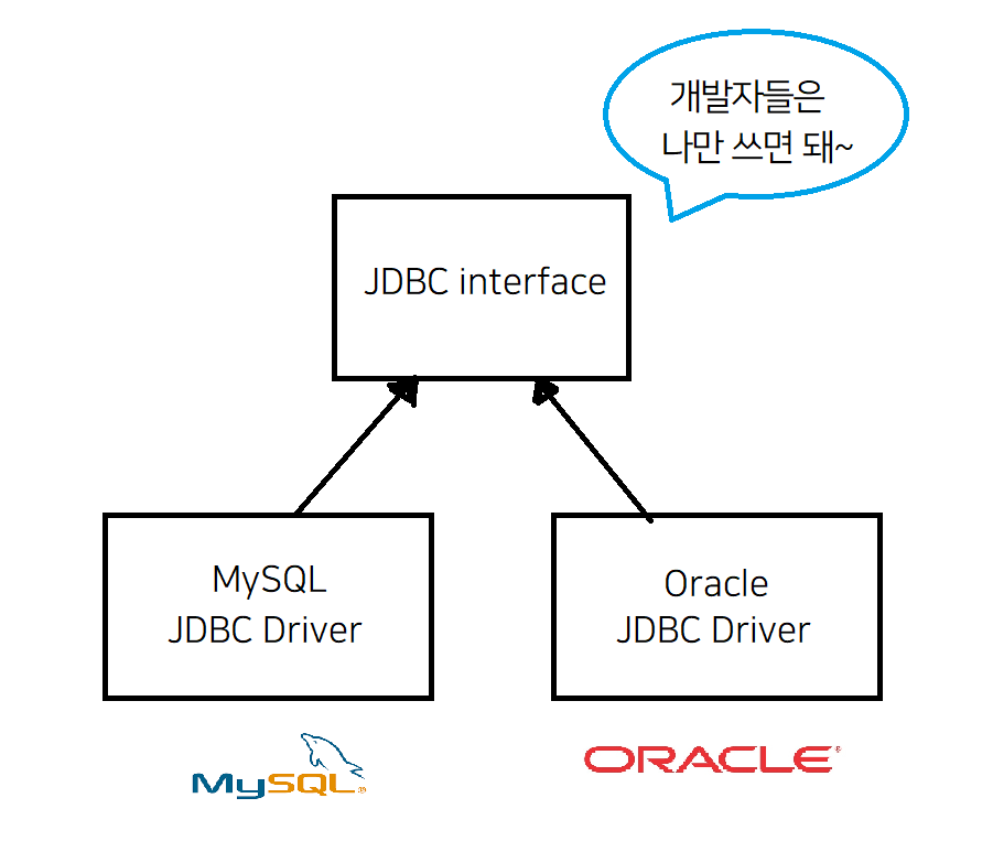 이제 개발자는 위 표준 인터페이스만 사용해서 개발하면 된다. 알다시피 코드는 인터페이스만 존재한다고 동작하지 않고 '구현체'를 필요로 한다. 요 JDBC 인터페이스를 각각의 DB 회사에서 구현해 라이브러리로 제공하는데 이것이 JDBC 드라이버다. MySQL JDBC 드라이버는 MySQL DB에 접근할 수 있게 하고 Oracle JDBC 드라이버는 Oracle DB에 접근할 수 있게 해준다.