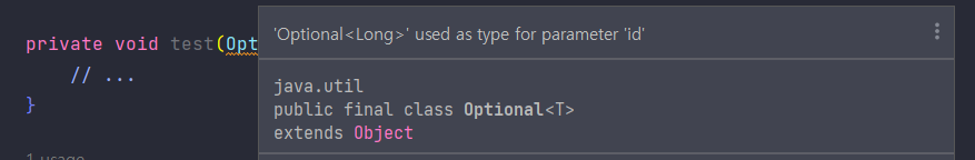 'Optional<Object클래스>' used as type for parameter '파라미터명' 경고