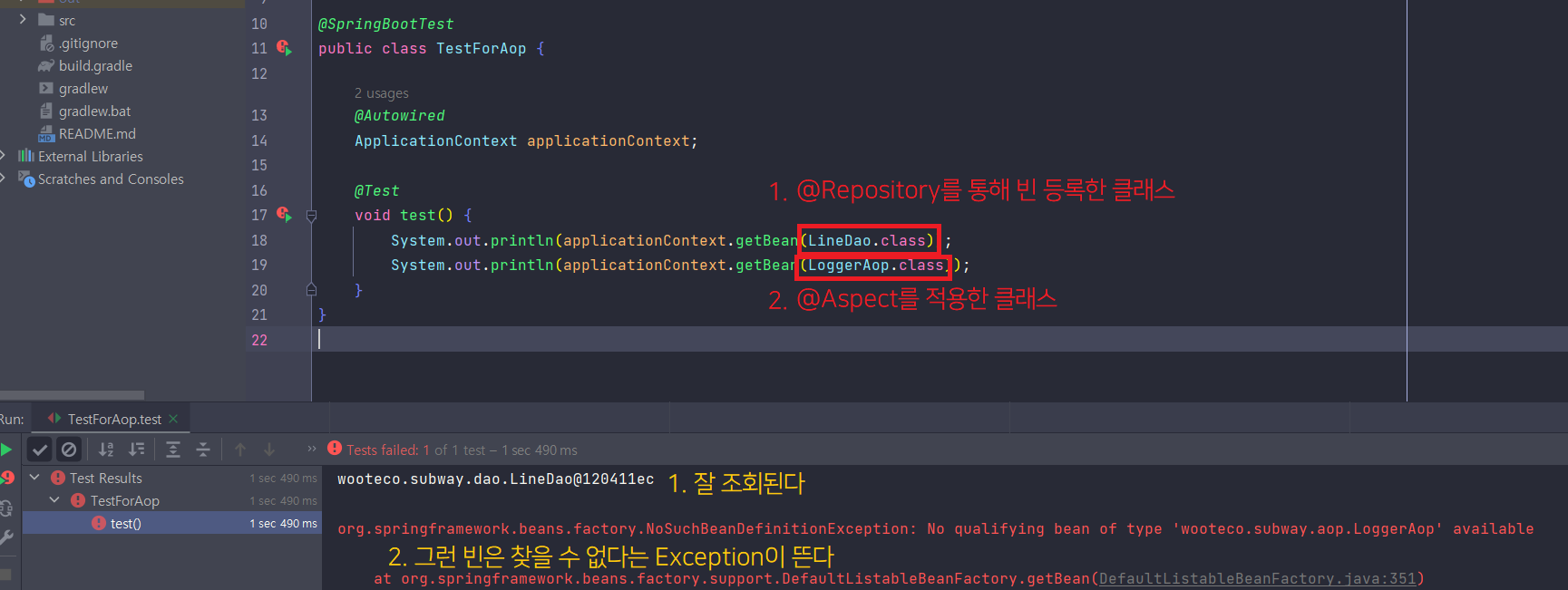 아래는 내가 작성한 테스트용 코드다. @Repository를 적용한 LineDao 클래스, @Aspect를 적용한 LoggerAop 클래스 두 개를 sout 해봤다. LineDao는 무사히 가져왔지만 LoggerAop에서는 해당 bean을 찾을 수 없다는 오류가 발생한다.