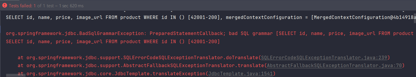 결론부터 말하자면 이프 말이 맞았다.(땡큐^ㅡ^b) productIds가 빈 값으로 들어오는 경우에는 IN () 안에 아무런 값도 들어가지 않아 SQL 문법 오류가 발생한다. 다양한 해결 방법이 있겠지만 데이터가 없는 경우에는 빈 배열을 반환해야 한다고 생각했다. 아래와 같이 list에 대한 검증 코드를 추가해주었다.