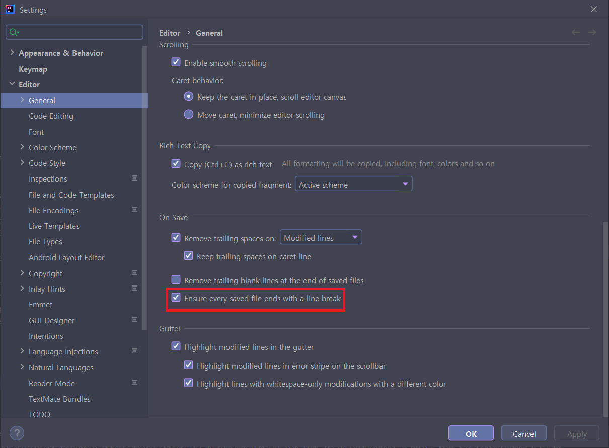 IntelliJ에서는 아래 설정을 통해 저장 시 마지막 라인에 줄바꿈이 들어가도록 설정할 수 있다.