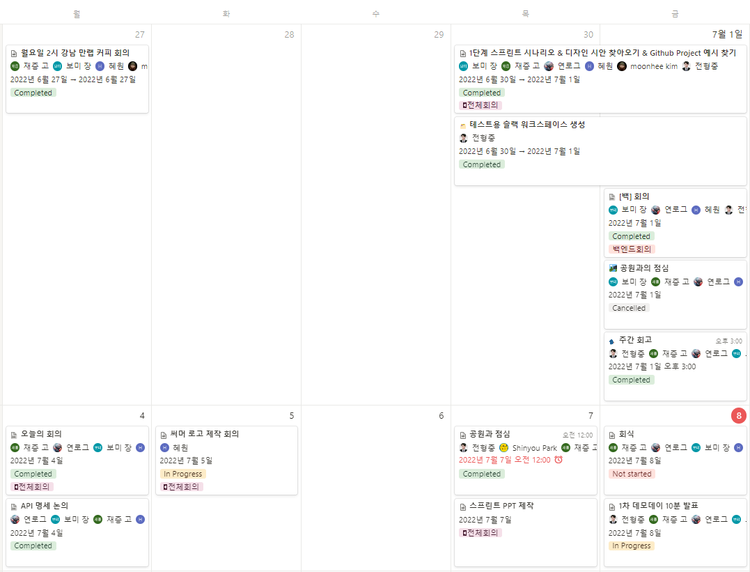 매일 데일리 스크럼 진행하기, 코어 시간 정하기, 주마다 회고하기 등등 여러가지 우리만의 팀 문화를 정했다. 나는 특히나 정해진 의견은 팀의 의견으로 정하자는 이야기가 마음에 들었다. 누군가 저거 왜저렇게 개발했어요? 라는 말이 나왔을때 아 전 저거 반대했었는데.. 이런 식으로 개인의 책임으로 떠밀거나 회피하는 케이스를 방지하고자 함이었는데 이런 저런 이야기를 통해 우리 팀원들의 배려심과 평소 사고를 알 수 있게 되어 좋았다. 😄