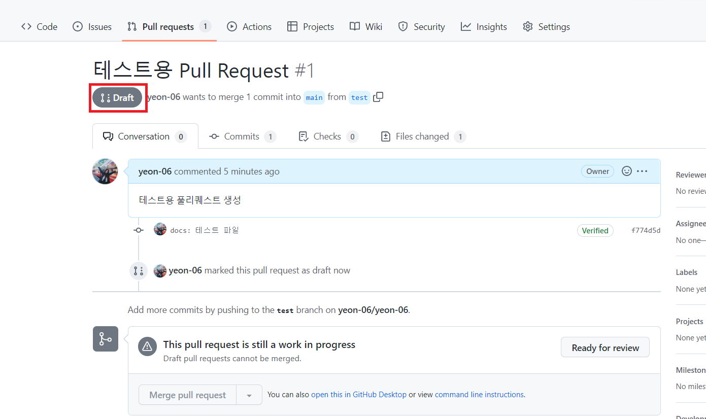 Draft 상태의 PR은 merge도 불가능합니다.