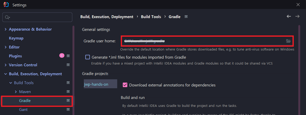 문제 원인은 Gradle user home이 프로젝트 경로로 설정되어 있어서이다.