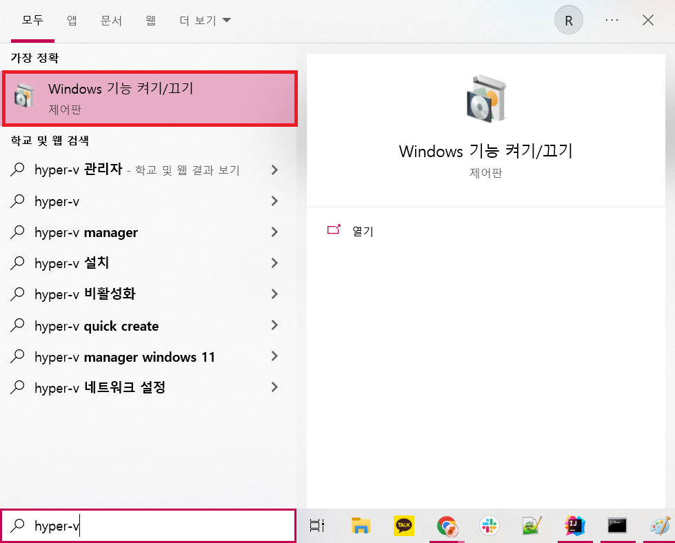 windows와 8080 port 키워드로 이것저것 구글링 하다보니 hyper-v라는 키워드를 발견하게 되었다. Hyper-V는 Windows에서 가상 머신을 사용할 수 있도록 도와주는 친구인데 해당 기능이 8080 port를 막는(block) 것 같다는 추측 글을 보았다. (좀 더 정확히 설명하자면 IntelliJ에서 사용해야하는 일부 port들을 Hyper-V에서 사용하기 때문에 제대로 동작하지 않는다는 글 같다.) 난 Hyper-V라는 것 자체를 처음 들어봤는데... 혹시 모르니 해당 설정을 확인해보기로 했다.