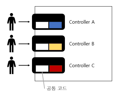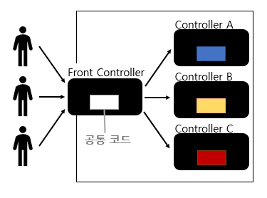 각 요청은 적합한 controller를 찾아서 로직을 찾아 수행하고 응답값을 반환 받는다. 헌데 여기서 모든 controller에 공통적으로 처리해야할 부분(하얀 상자)이 존재한다. 현재 들어온 request가 이 controller에서 처리하는 것이 맞는지에 대한 로직일수도 있고 Exception이 발생한 경우 어떻게 처리하는지에 대한 로직일 수도 있다. 여기서 등장한게 front controller 패턴이다.