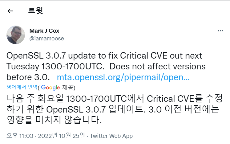 OpenSSL의 개발자인 Mark Cox가 아래와 같은 트윗을 남겼다.