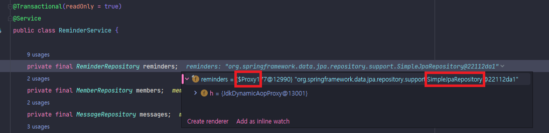 Custom Repository을 사용하는 곳에서 디버그 해보면 SimpleJpaRepository가 proxy 형태로 주입되는 것을 확인할 수 있다.