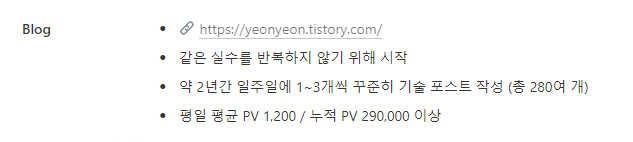 그렇다면 내 매력 포인트를 이력서에 어떻게 녹여낼 수 있을까? 고민했는데 나 같은 경우에는 다행히 블로그가 3가지를 모두 증명할 수 있었다. 그래서 이력서에 짤막하게 ~내 블로그 자랑 코너~를 만들었다. (아래 이미지 참고) 실제로 면접 때마다 내 이력서에서 무엇이 기억에 남는지 매번 여쭤봤었는데 대부분이 블로그를 꼽아주셨다.