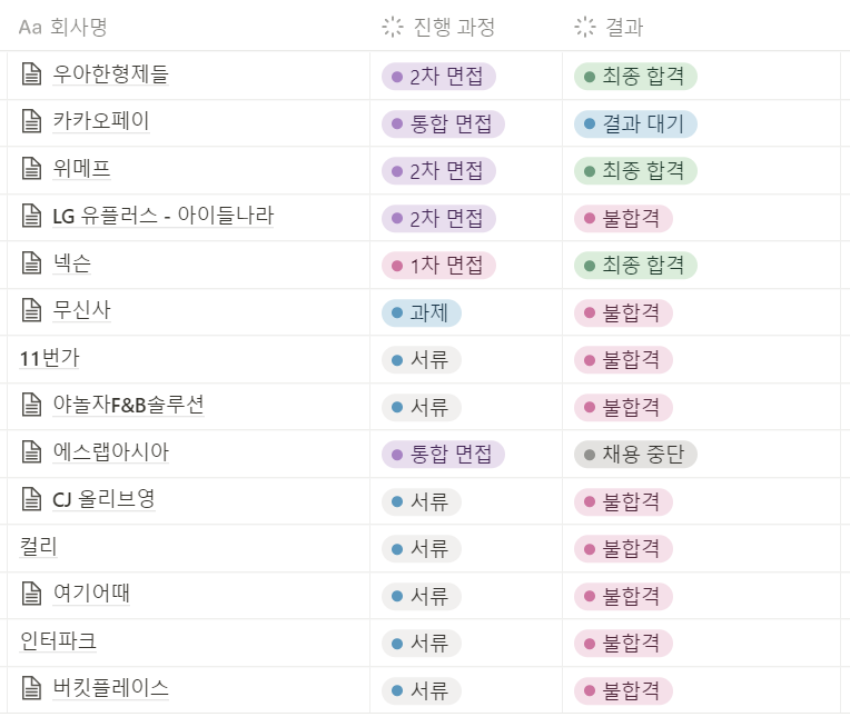 이력서를 여기저기 넣으면서 '이 정도 지원하면 1~2군데 정도는 연락 주지 않을까?'라는 생각을 했는데 예상보다 많은 곳에서 연락이 왔었다. 그래서 과제 해야 하는데 코테랑 면접 봐야해서 과제 못하고, 면접 공부 해야 하는데 과제 해야 해서 면접 망하고 이런 루틴이 반복될 때가 있었다. 동시에 5개의 회사에서 과제, 코테, 면접을 진행하던 주도 있었다.😱 정말 정신 나갈 것 같은 기간이었는데... 회사에서 일정 연장을 해주면 정말 좋겠지만 그렇지 않은 경우가 많기 때문에(ㅠㅠ) 일정을 잘 산출하고 지원해야 하는구나, 라는 생각을 했다.