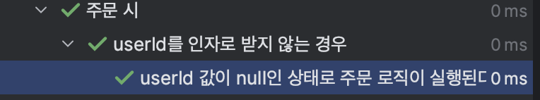 order(orderRequest, userId)에서 userId가 null이라면 어떻게 동작하는지 테스트 코드 작성하기. 이미 order(orderRequest, userId)의 테스트에서 검증한 부분이지만 테스트 코드를 중복으로 작성하면 된다. 이렇게 되면 정말 꼼꼼한 테스트 코드를 짤 수 있다. 하지만 order(orderRequest, userId)의 로직이 변경된다면 변경해야하는 테스트 코드가 불필요하게 많아진다는 느낌이 들었다. order(orderRequest, userId)와는 별개로 order(orderRequest)의 동작만을 검증하고 싶다고 생각했다.