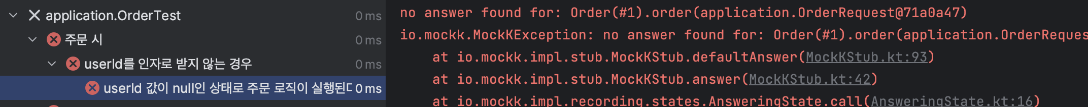 하지만 verify를 사용하기 위해서는 Order 객체를 모킹해야한다. Order의 메서드를 검증해야하는데 Order를 모킹해야하는 기묘한 상황이 온 것이다. 위 테스트 코드는 당연하게도 MockkException이 발생한다.