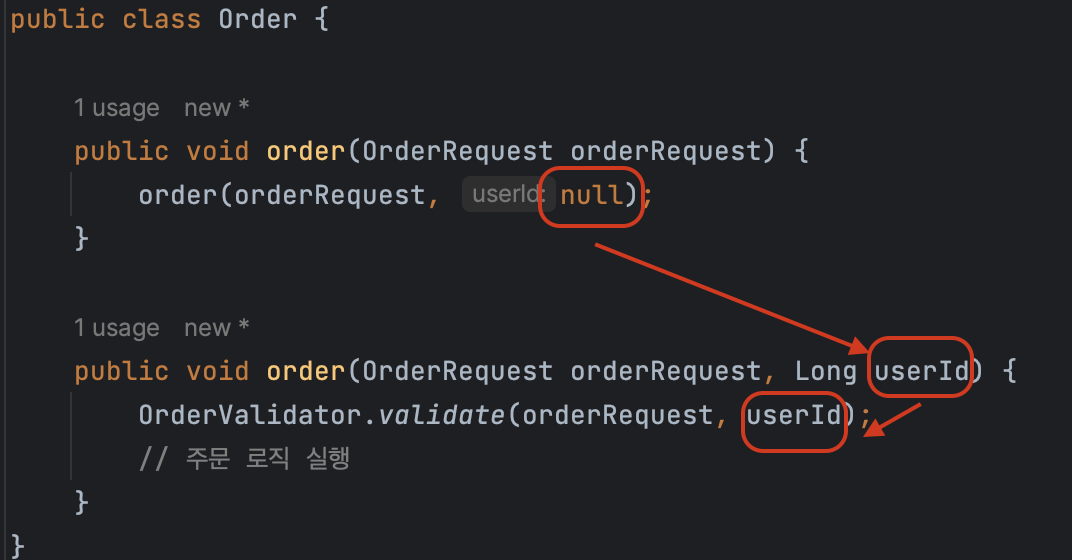 여기서 문제는 모킹한 객체에 대한 인자를 확인할 수 있다는 것인데 나는 실제 객체의 내부 메서드에 넘어가는 인자를 확인해야한다. 해당 객체를 모킹할 수 없기 때문에 약간의 타협을 봤다. 여기서 order(orderRequest, userId) 코드를 잠깐 다시 보면 인자로 넘어가는 값을 OrderValidator를 통해 검증하는 것을 확인할 수 있다. 나는 이 OrderValidator를 이용해 userId가 실제로 null 값이 넘어오는지 검증하기로 했다. 내가 생각하는 이상적인 테스트 코드는 아니지만 내 의도를 위해 어쩔 수 없는 타협이었다.🥲