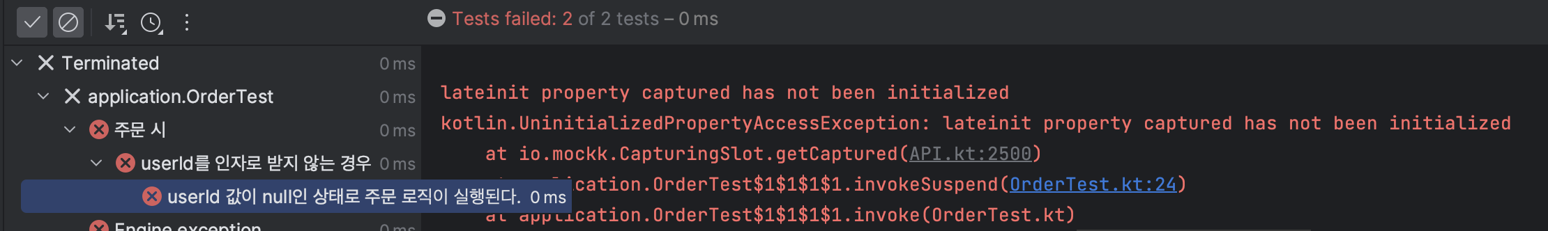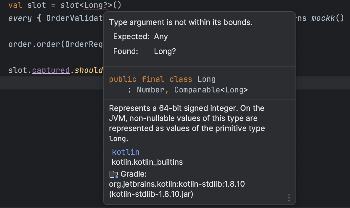 slot에 캡쳐된 값이 없어서 발생하는 문제이다. 하나하나 디버그를 해보면 order(orderRequest) -> order(orderRequest, userId) -> OrderValidator.validate(orderRequest, userId) 순으로 동작된다. 인자로 넣은 값들도 내가 의도한 값이랑 일치한다. 근데 왜 테스트에서는 예외가 발생하는걸까? 이 부분에 대해서는 친구와의 대화를 통해 알게 되었는데 코틀린은 null 값을 넣으려면 타입 뒤에 ?를 붙여야한다고 한다.