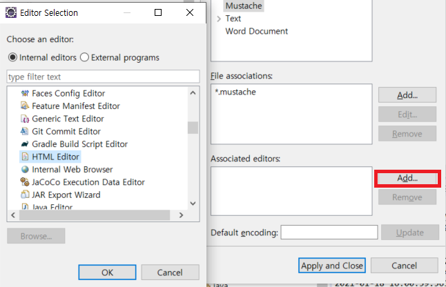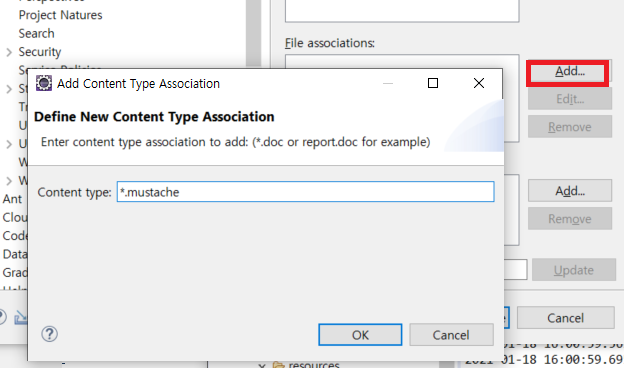 File associations의 Add 버튼을 누르고 *.mustache 추가