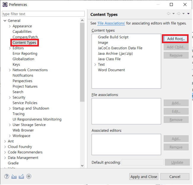 마지막 Default encoding에는 UTF-8을 입력하고 Apply and Close를 누르면 된다.
