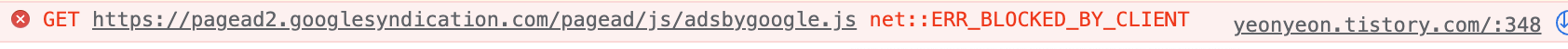 위 문구를 구글링해보면 많은 사람들이 답변해주고 있다. AdBlock등과 같은 크롬 플러그인에서 브라우저에서 어떤 리소스를 가져오는 것을 차단하기 때문에 발생하는 오류이다. 나도 AdBlock을 사용하고 있었고, 플러그인을 끄니까 더이상 문제가 발생하지 않았다.