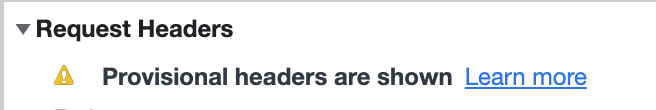 그런데 이상한 것이 뜬다. preview, response 같은 것도 전혀 뜨지 않는다. request header에 아래와 같은 경고 문구(?) 같은 게 발생했다.