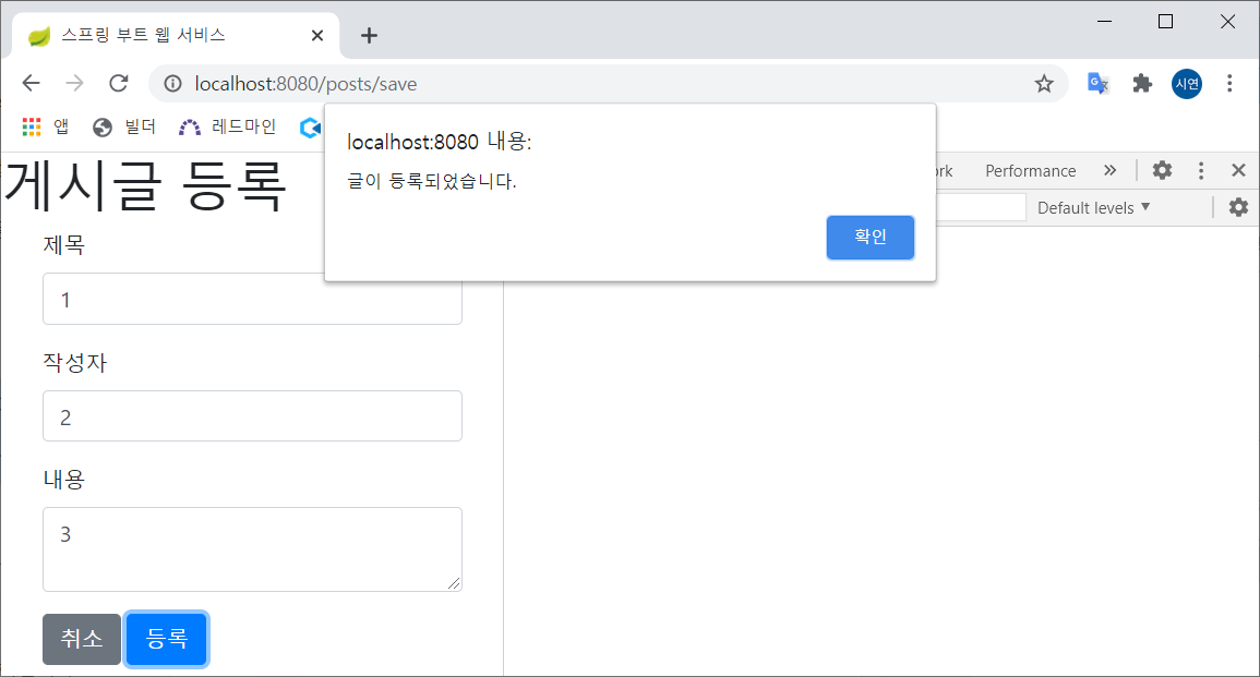이제 브라우저에서 테스트해본 뒤 db도 확인하면 데이터가 무사히 등록된 것을 확인할 수 있다.