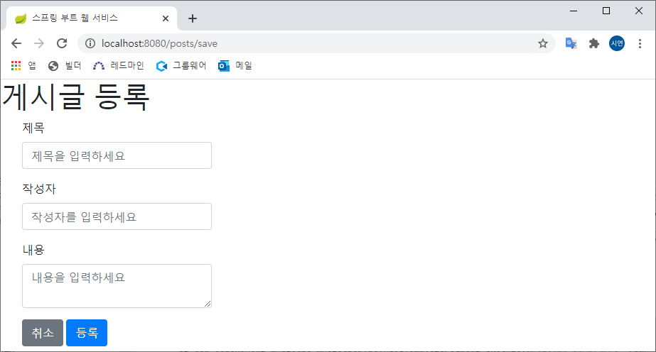 - /posts/save를 호출하면 posts-save.mustache를 호출하는 메소드