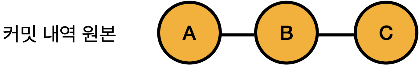 git revert란 일부 기존의 커밋들을 되돌리는 작업이다. git reset과는 다른 것이, git reset은 기존의 커밋을 아예 삭제해버린다. 하지만 git revert는 변경 사항을 되돌린 커밋을 하나 새로 생성한다. 예를 들어 아래와 같은 커밋 A, B, C가 있다고 가정해보자. (알파벳은 커밋을 구분하기 위해 임의로 붙인 이름이다.)