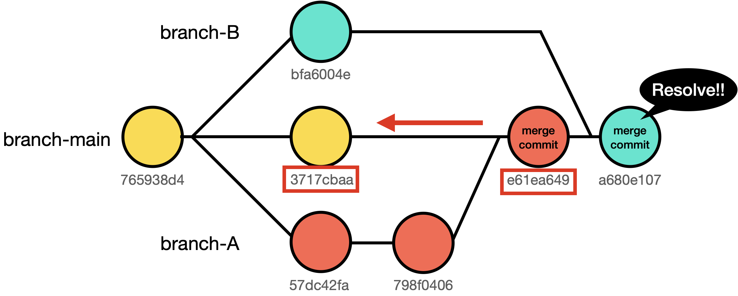 아래와 같은 커밋 히스토리에서 branch-A에서 작업했던 내역들을 제거해보자. resolve가 일어난 커밋 a680e107은 e61ea649와 같은 소스 코드를 수정하여 충돌이 발생했었다고 가정한다.