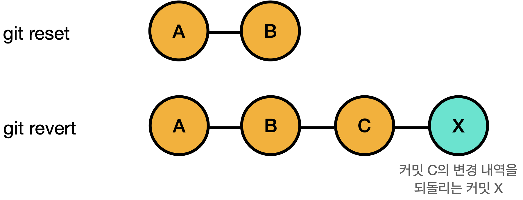 이 때 커밋 C의 변경 내역을 reset, revert를 통해 되돌린다면 어떻게 될까? 커밋 내역을 살펴보면 git reset은 커밋 C에 대한 기록이 아예 없어진다. git revert는 새로운 커밋 X가 생긴다. 커밋 X의 변경 내역을 살펴보면, 커밋 C에서 변경했던 코드들이 그 이전 상태로 돌아가있다.