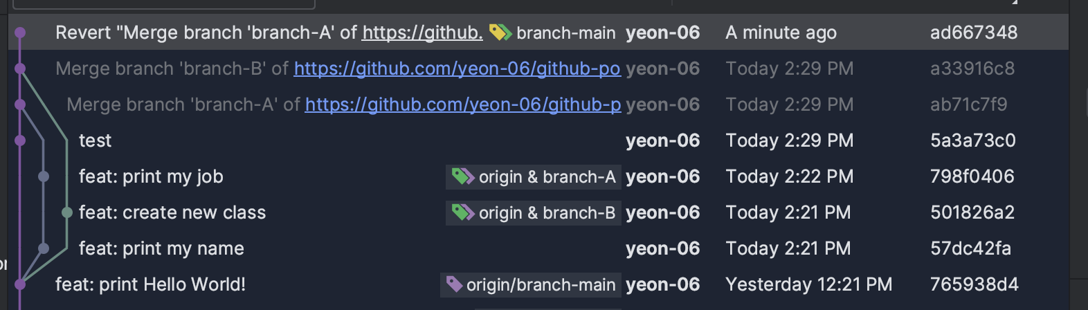 이때 특정 브랜치에서 작업했던 내역을 revert하고 싶으면 어떻게 할까? 아까 추가옵션 중 하나였던 -m을 이용하면 된다.