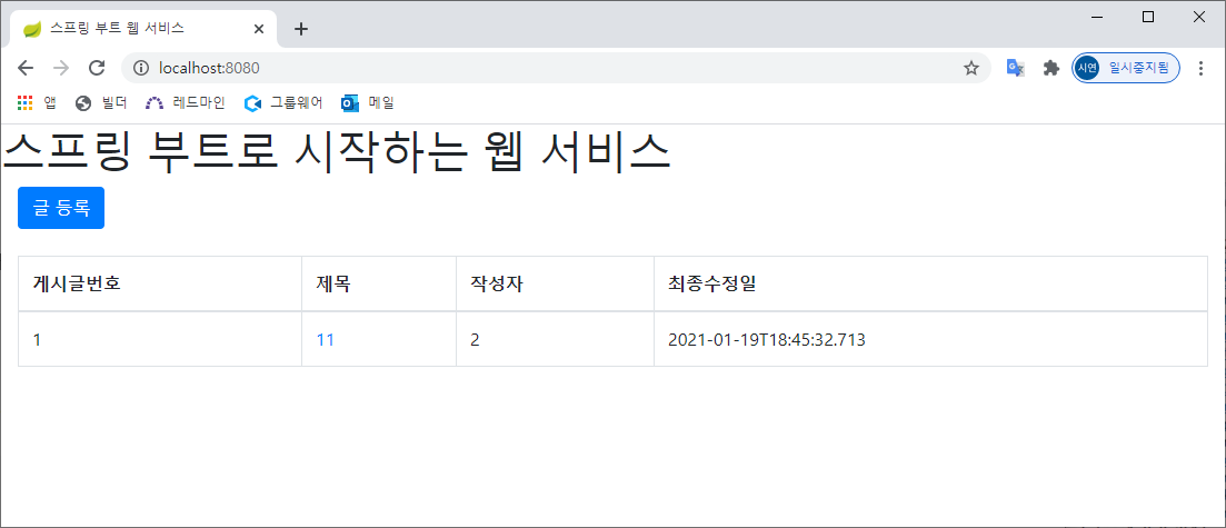 이제 Application.java를 실행하고 locahost:8080을 접속하면 게시글 목록이 뜬다