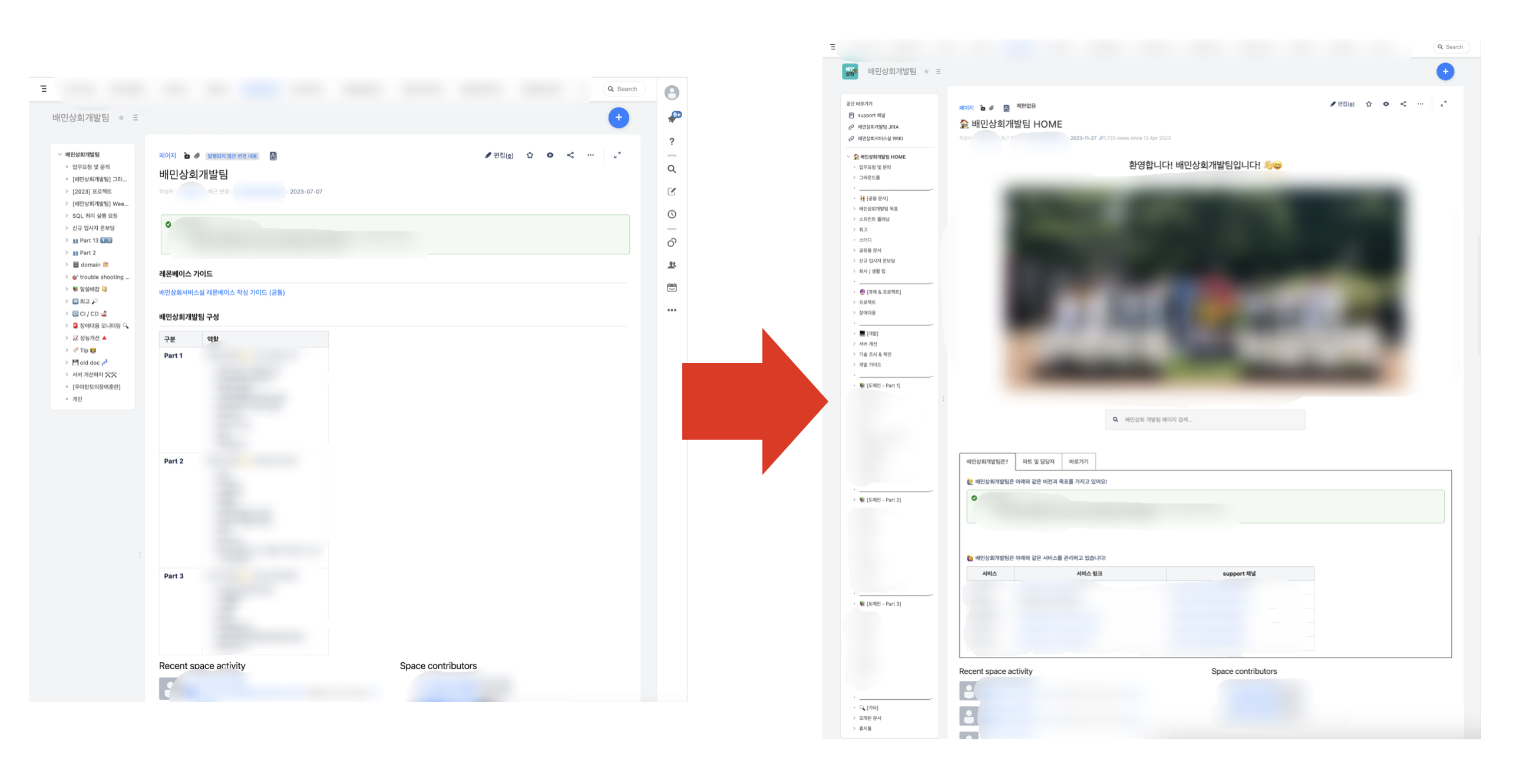 정말 운이 좋게도 기회가 찾아왔다. 조직 개편이 일어나면서 팀별로 새로운 위키 공간을 갖게 된 것이다. 위키 작성이 쉬워질 거라 기대했지만, 오히려 어디에 문서를 생성할지 몰라서 혼란을 겪는 팀원분들이 많았다. 그래서 팀원분들께 양해를 구한 뒤, 직접 위키 개편을 시작했다. 딱딱한 메인 화면에 단체 사진을 넣고, 우리 팀 소개글도 적었다. 게시판을 만들어서 게시글을 분류했다. 불필요한 글을 삭제하고, 옛날 위키에만 존재하는 글 중에서도 필요한 글을 가져왔다.