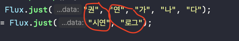 var lastNameFlux = Flux.just("권", "연", "가", "나", "다");