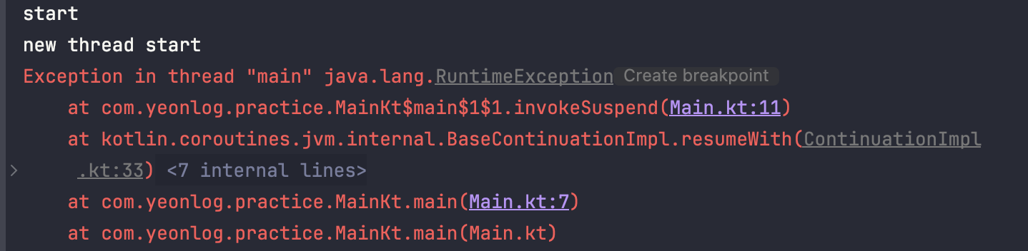 하지만 코루틴에서는 자식 코루틴에서 예외가 발생하면 부모 코루틴으로 예외가 전파된다. 위 예제에 코루틴을 적용시킨 결과를 비교해 보자.