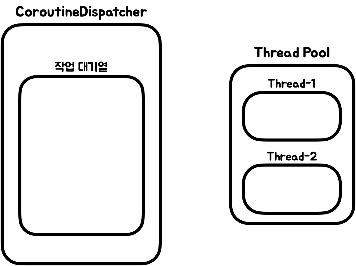 CoroutineDispatcher는 아래와 같은 그림처럼 동작한다. CoroutineDispatcher 객체는 스레드풀을 사용할 수 있고, 이 스레드풀은 2개의 스레드로 구성되어 있다. CoroutineDispatcher은 작업 대기열을 갖고 있는데, 이 작업 대기열에는 실행되어야 하는 작업들이 저장될 수 있다.