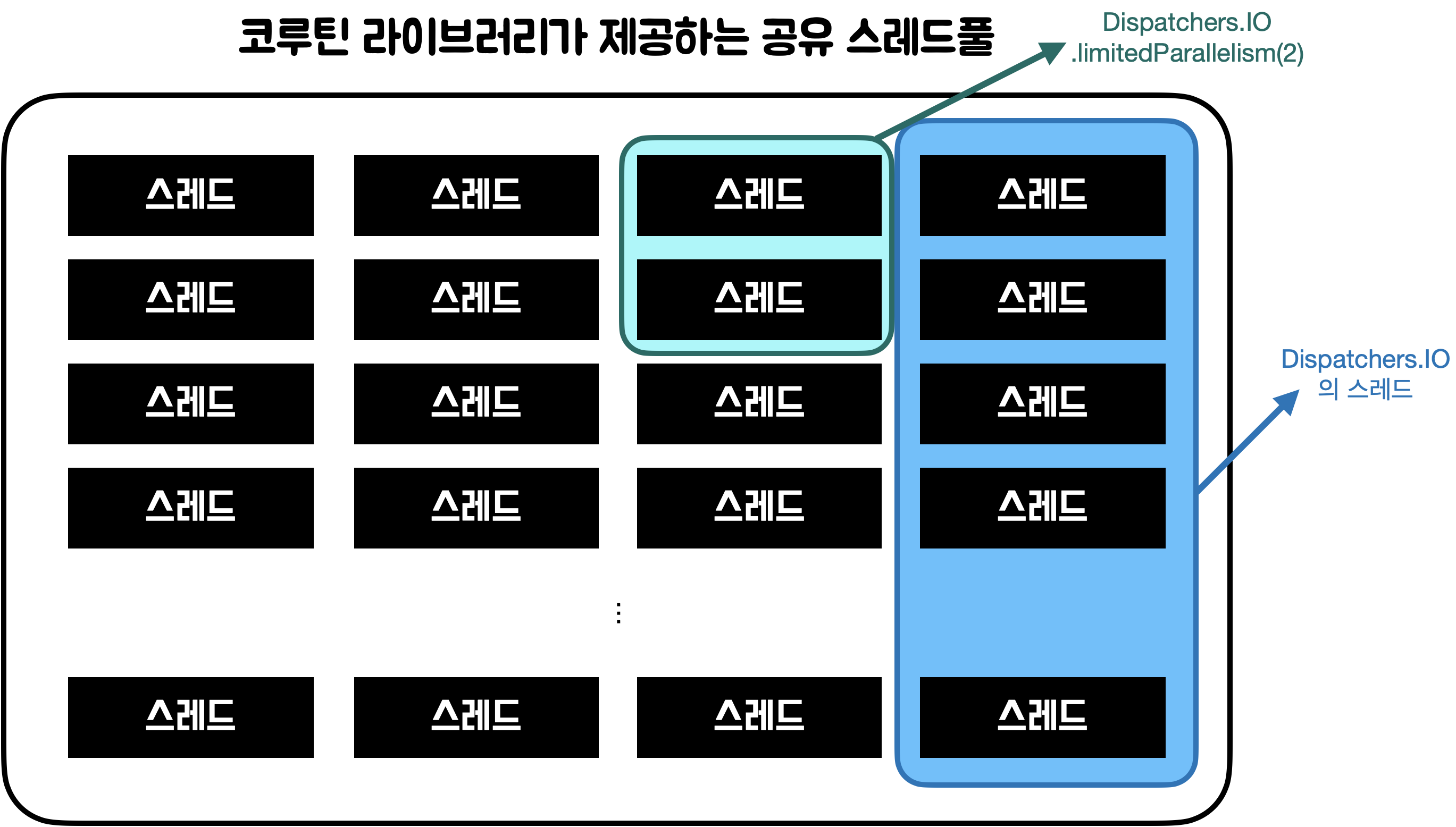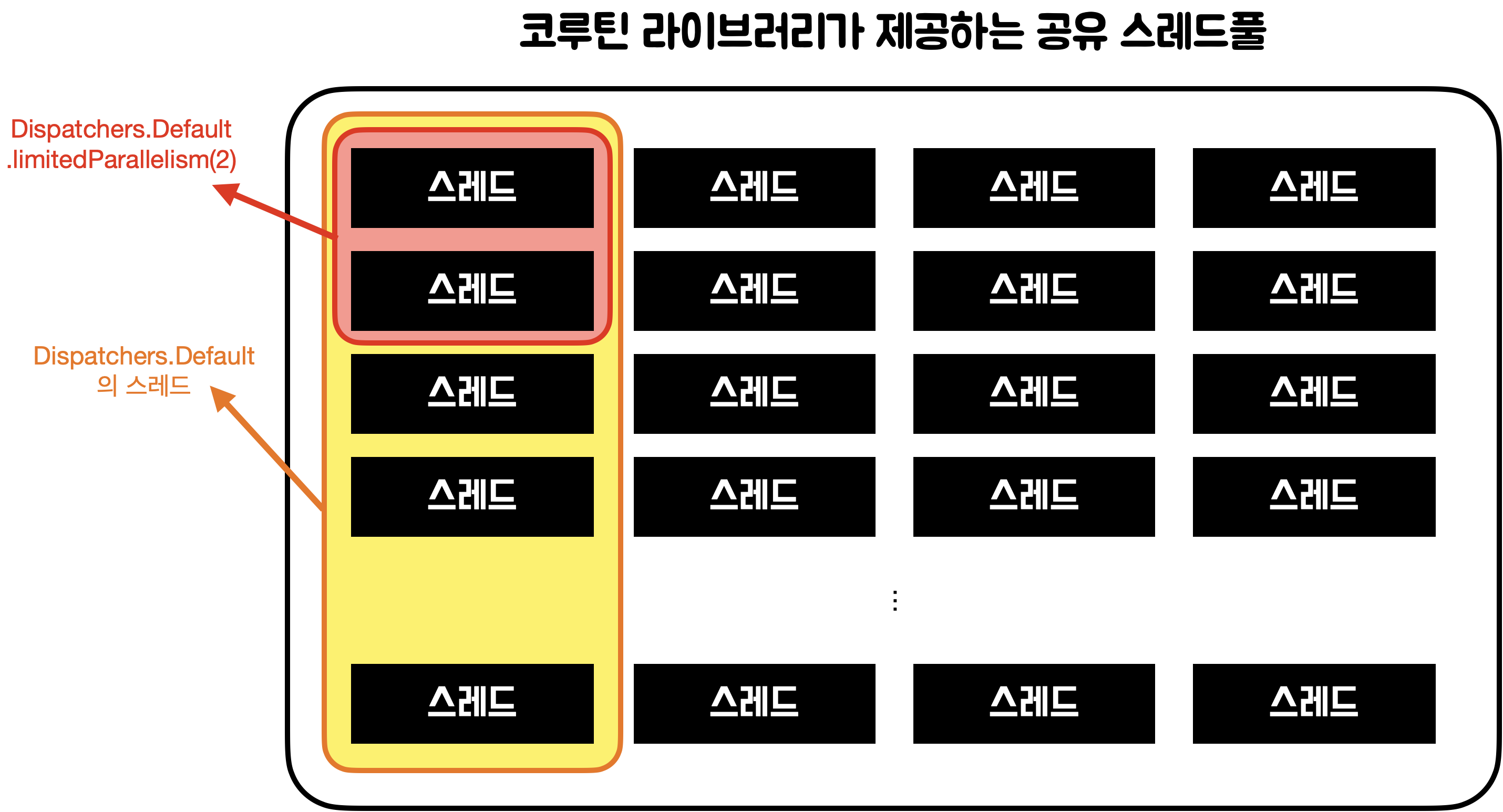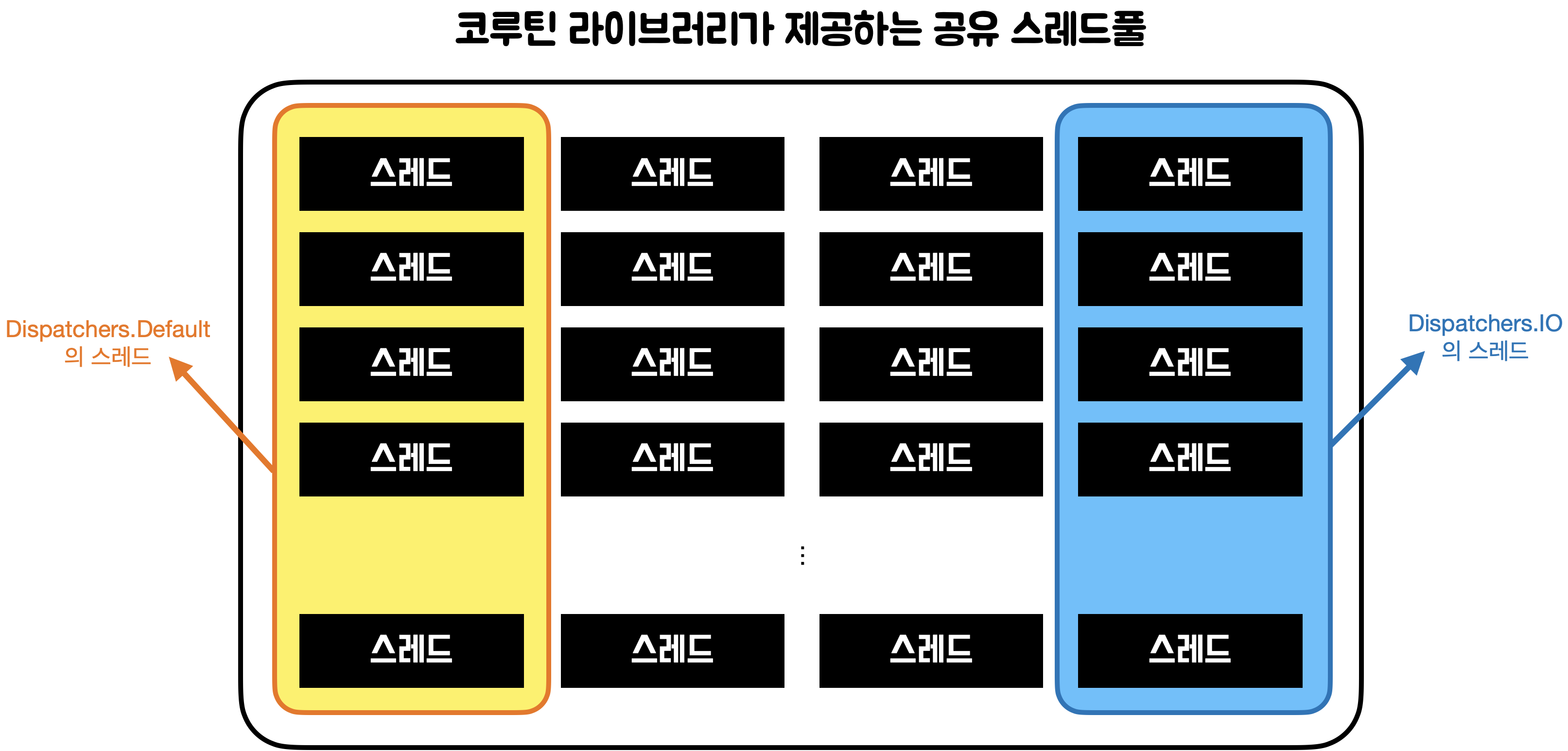 Dispatchers.Default와 Dispatchers.IO는 같은 스레드풀을 공유하고 있다. 코루틴 라이브러리는 애플리케이션 레벨의 공유 스레드풀을 제공하고 있다. 이 공유 스레드풀은 스레드를 무제한 생성할 수 있으며, 스레드 생성 및 사용을 위한 API를 제공한다. Dispatchers.Default, Dispatchers.IO는 이 코루틴 라이브러리가 제공하는 API를 사용해 구현됐기 때문에 같은 스레드풀을 사용하는 것이다. 그림을 그려보자면 아래와 같다.