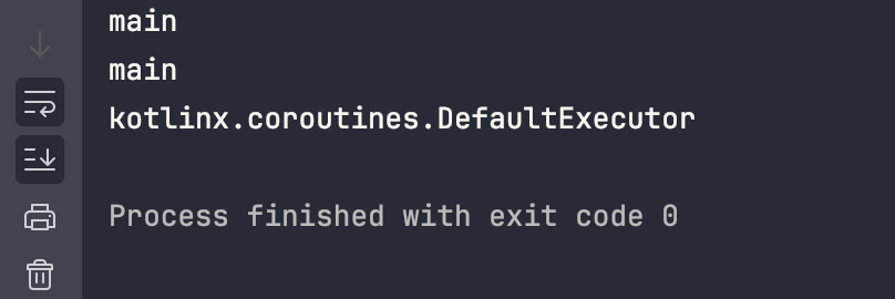 단, 무제한 디스패처를 사용하는 코루틴에서 중단이 일어나면 재개 시에는 자신을 재개시키는 스레드에서 실행된다. 아래 예제에서는 DefaultExecutor를 통해 실행되는 것으로 보이는데, 이는 delay 함수를 실행하는 스레드이다.